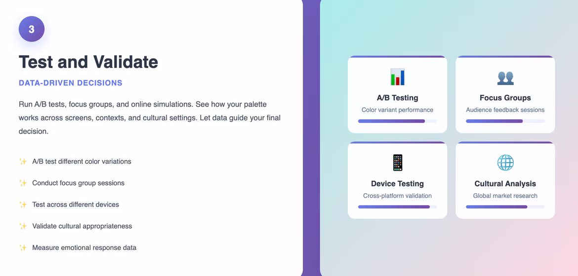 Run A/B tests, focus groups, and online simulations. See how your palette works across screens, contexts, and cultural settings.